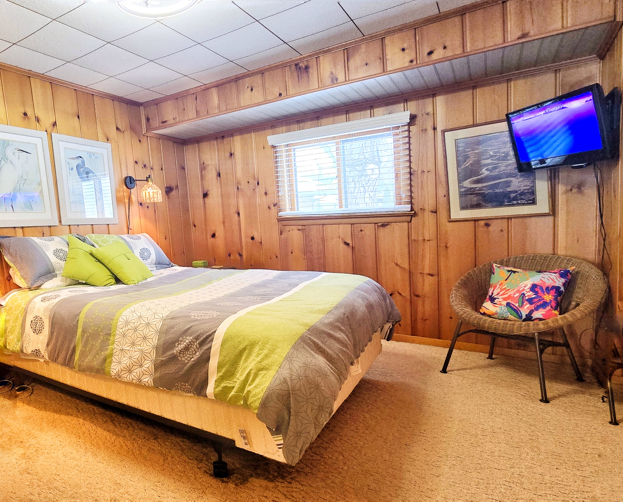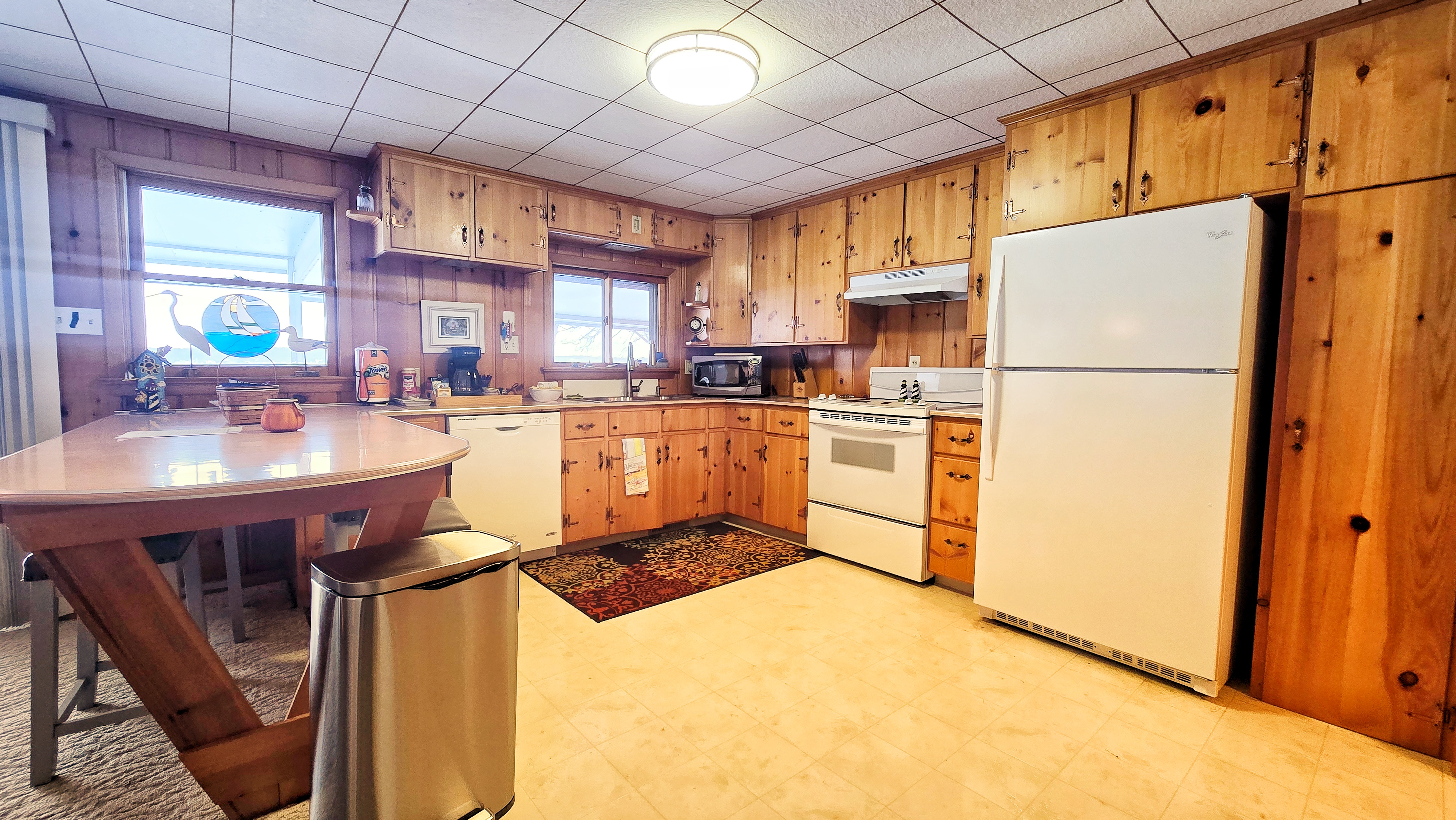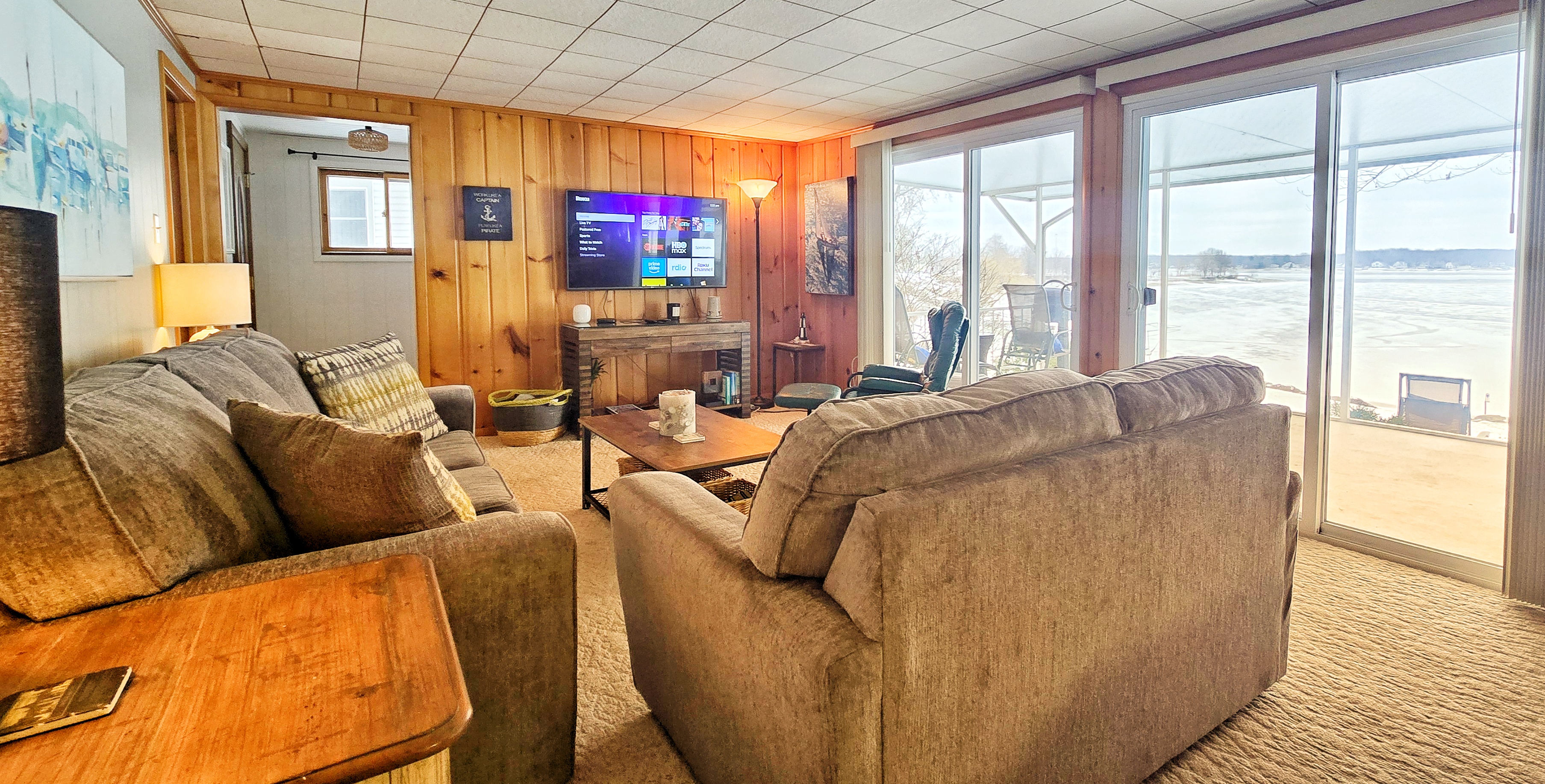 Step back in time in our charming 1950s-style lakeside cottage. The space is designed for comfort and relaxation. Living Room: Features a cozy couch, loveseat, recliner, and a Smart TV for you to log into your favorite streaming services. Kitchen: A fully stocked kitchen with everything you need to prepare meals. We provide a starter supply of dishwasher tabs. Bedrooms: Two comfortable bedrooms, each with a queen bed and ample clothing storage. Storage: A large coat closet is available at the front door for your winter gear. Please note: As a lakeside home, you may occasionally encounter spiders or other bugs, especially as seasons change. Our housekeepers work diligently to keep the cottage clean.
